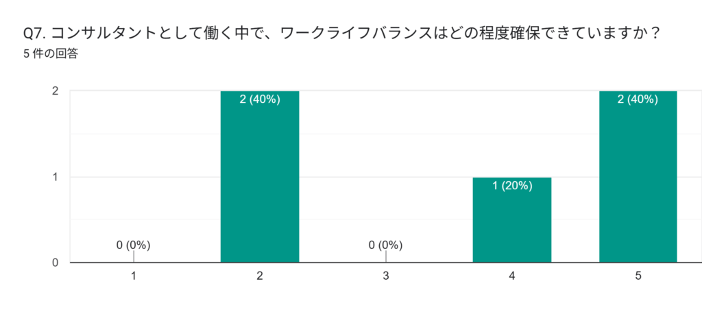 「ワークライフバランスを確保できている」が5、「全く確保できていない」が1として5段階で評価してもらったところ、平均3.25という結果になりました。「非常に確保できている」と答える人もいれば、「まだ課題がある」と感じる人もいるなど、個人差が見られます。