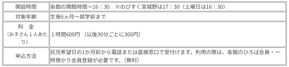 また、ひと月あたりの利用希望時間が月10時間以内であること。 - 利用料:お子さん1人1時間あたり標準300円