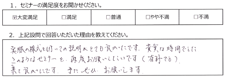 - 「実際の様式を用いた説明がとても良く、有料でも再度お願いしたいと思えるほど貴重な時間だった」